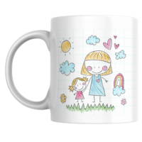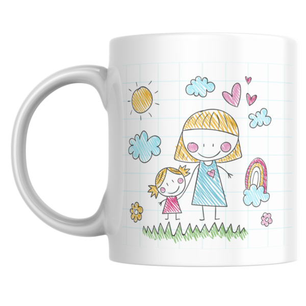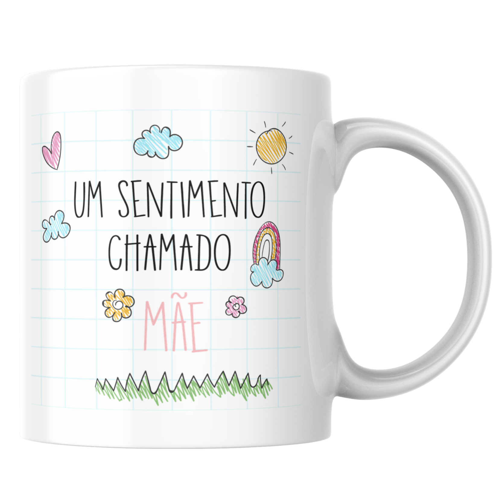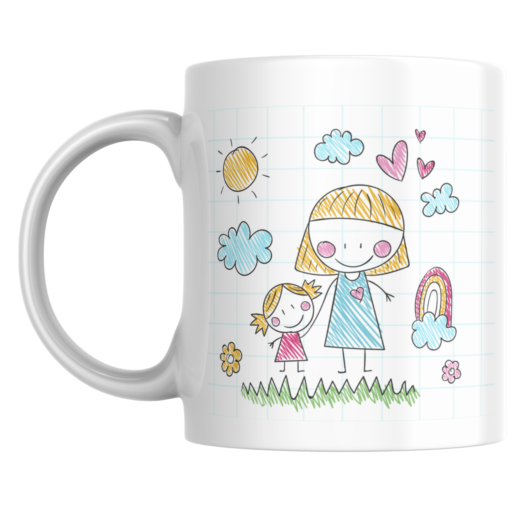 Há desenhos que não são apenas desenhos, são memórias em estado de cor. Nesta caneca, o sol sorri, as flores dançam e duas figuras de mãos dadas parecem guardar um segredo bonito: o amor simples e gigante entre mãe e filho.